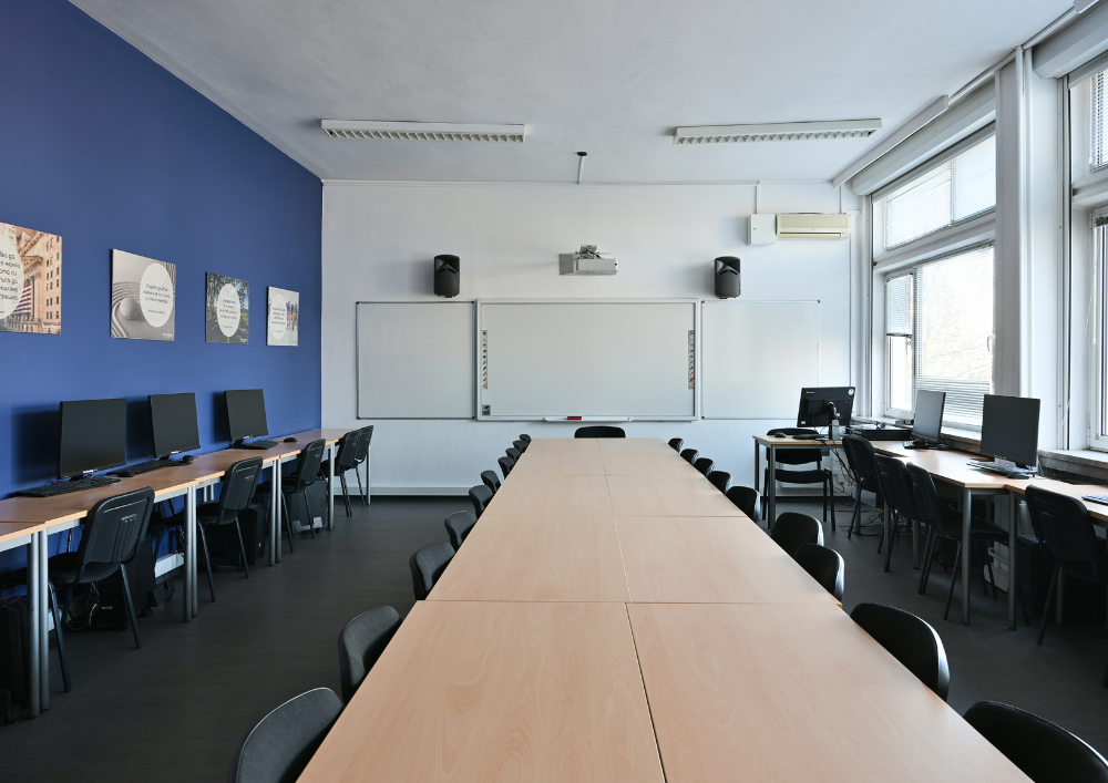 Оборудвана е с интерактивна дъска, мултимедиен проектор, компютърни конфигурации със специализиран софтуер, дарение от инвестиционния посредник BenchMark. Залата разполага с 45 места. |