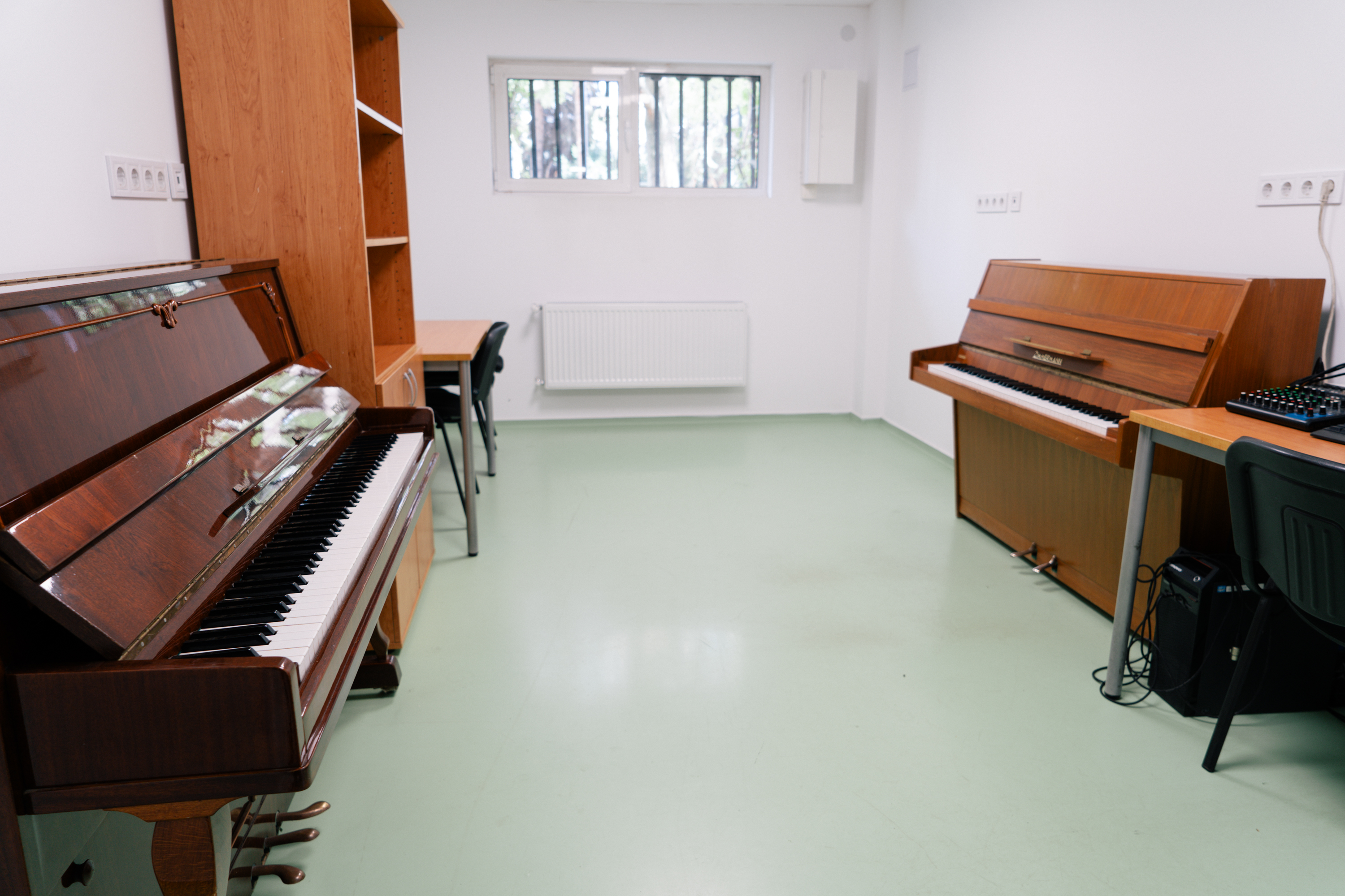 | Оборудвана е с пиано за занимания на студенти от програмите по музика, както и с компютърна техника със специализиран софтуер. |