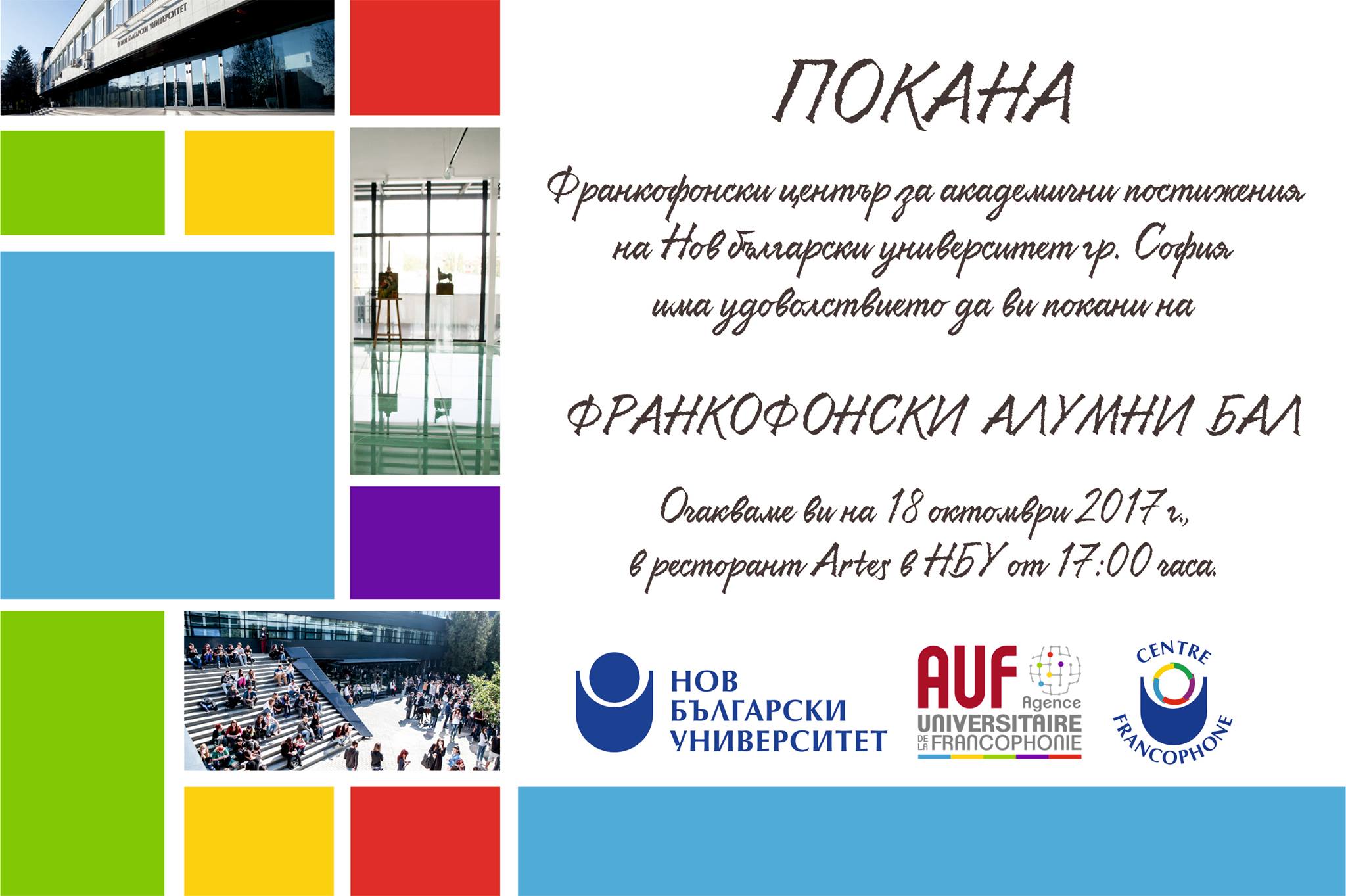 Балът на алумните-франкофони е първото по рода си събитие в Нов български университет. То ще събере на едно познато място – ресторант Артес на НБУ – бивши и настоящи студенти, вече завършили и все още изучаващи специалности на френски език, както и преподавателската франкофонска общност в Университета.