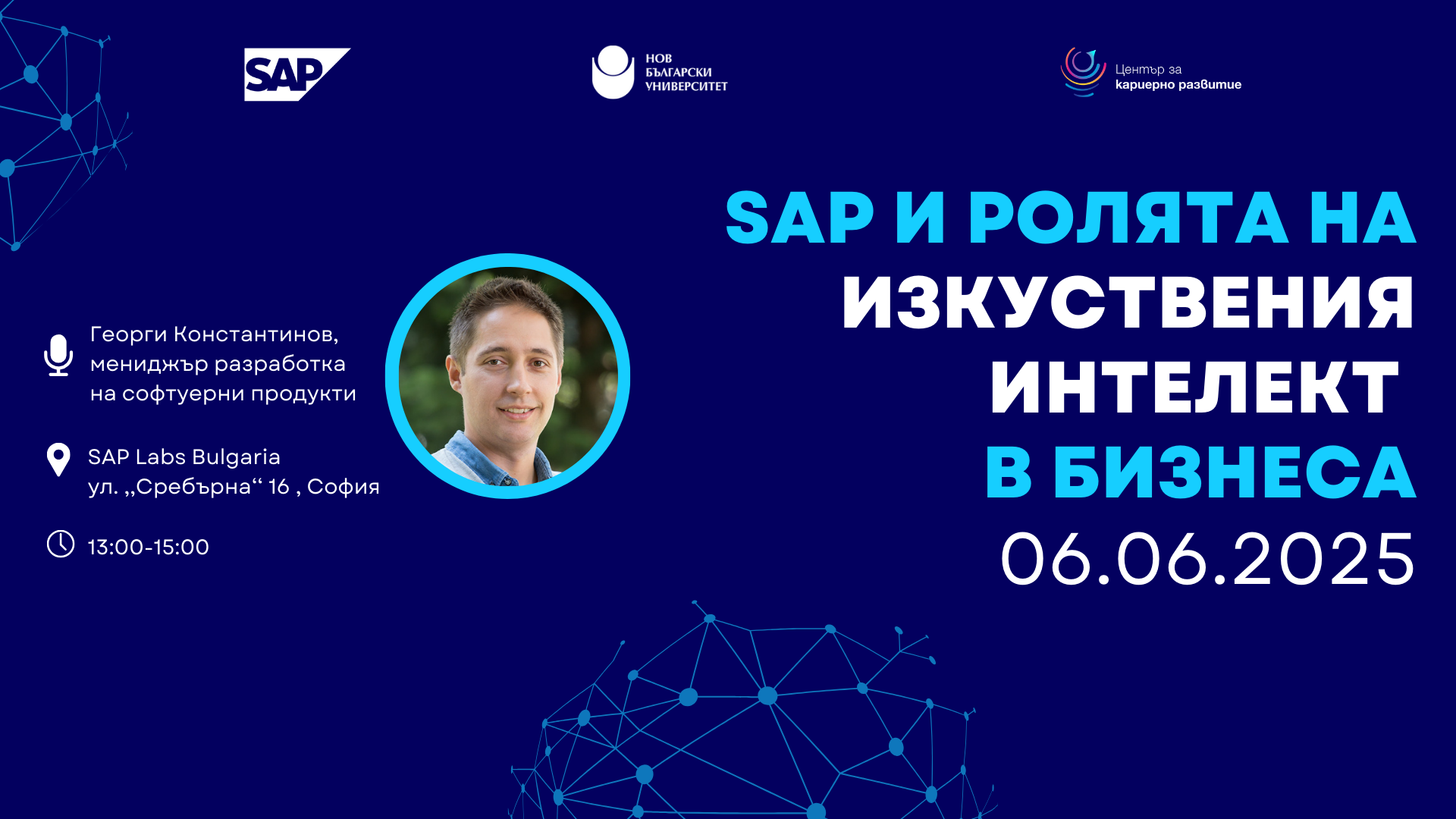 SAP e най-голямата софтуерна компания в Европа. В ядрото на стратегията на SAP е приложението на изкуствен интелект в управлението на мултимилиардни компании и техните процеси. Лекцията е чудесна възможност да научим как SAP и изкуственият интелект за бизнеса участват в ежедневието на всеки от нас.