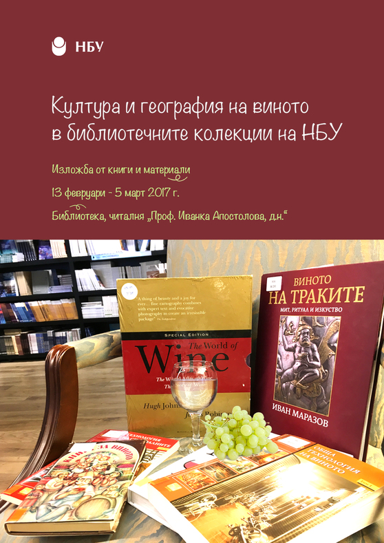 Начало Библиотека За библиотеката Изложби Архив Архив Култура и география на виното в библиотечните колекции на НБУ 13 февруари - 5 март 2017 г. Библиотека, читалня „Проф. Иванка Апостолова, д.н.“ Плакат Резюме Електронни ресурси
