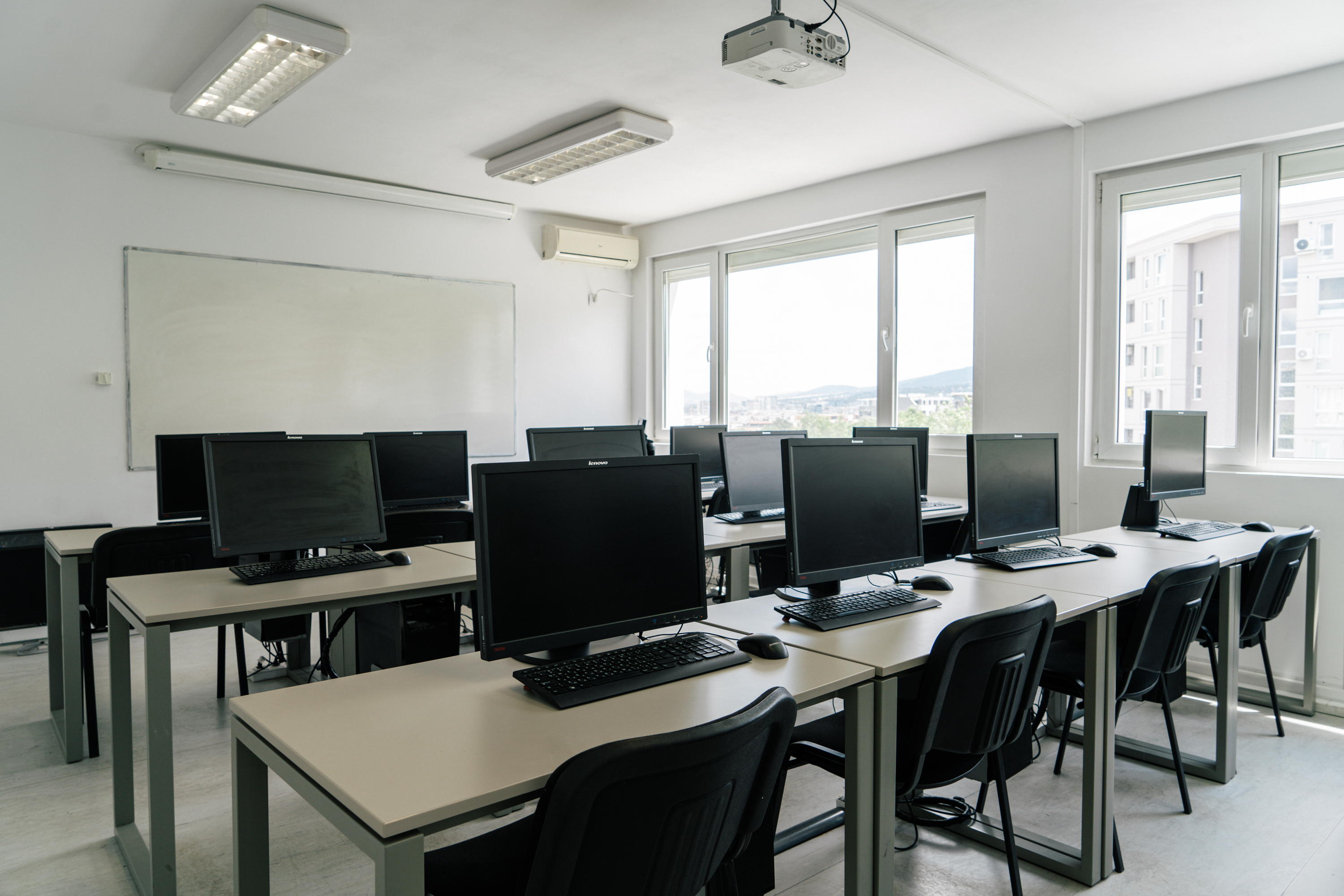 | Шест езикови зали, всяка от които разполага с 16/30 места. Оборудвани са с компютърна конфигурация, мултимедиен проектор, интерактивен маркер, бяла дъска и специализиран софтуер за чуждоезиково обучение. |